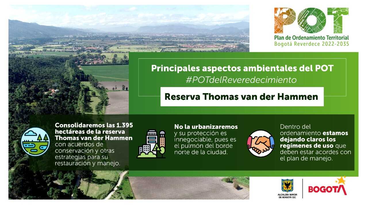 Este POT va a proteger y consolidar la reserva Thomas van der Hammen en sus más de 1.395 hectáreas con acuerdos de conservación y otras estrategias para su restauración y manejo. No se urbanizará y su protección es innegociable, pues es el pulmón del borde norte de la ciudad. Además, será el ecosistema protegido de mayor importancia en un borde de ciudad de América Latina.